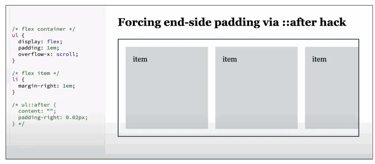 在《你所不知道的CSS Overflow Module》一文中和大家一起聊了有关于CSS Overflow Module中的相关知识。但我们有一个关于Flexbox容器上使用overflow和padding的场景忽略了。即:忽略滚动容器末端边缘的padding。比如: