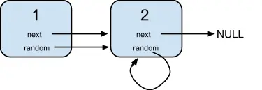 节点 2 的值是 2,它的下一个指针指向 null,随机指针指向它自己。