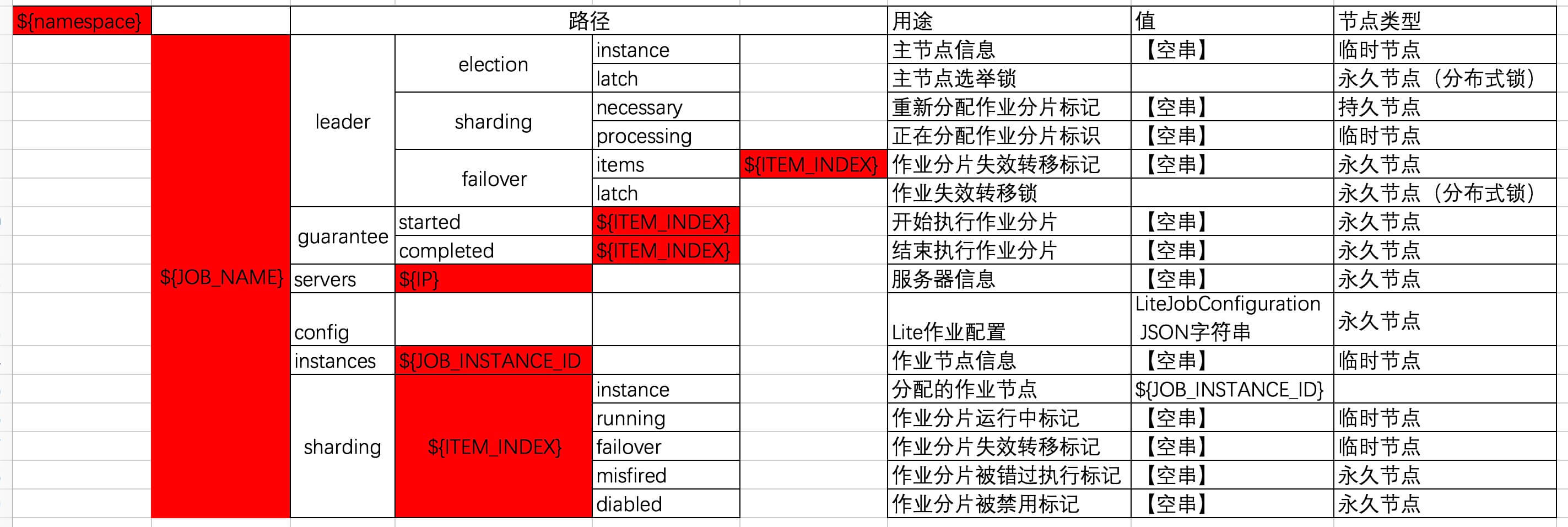 | Zookeeper 路径 | JobNodePath 静态属性 | JobNodePath 方法 | 节点路径类 |