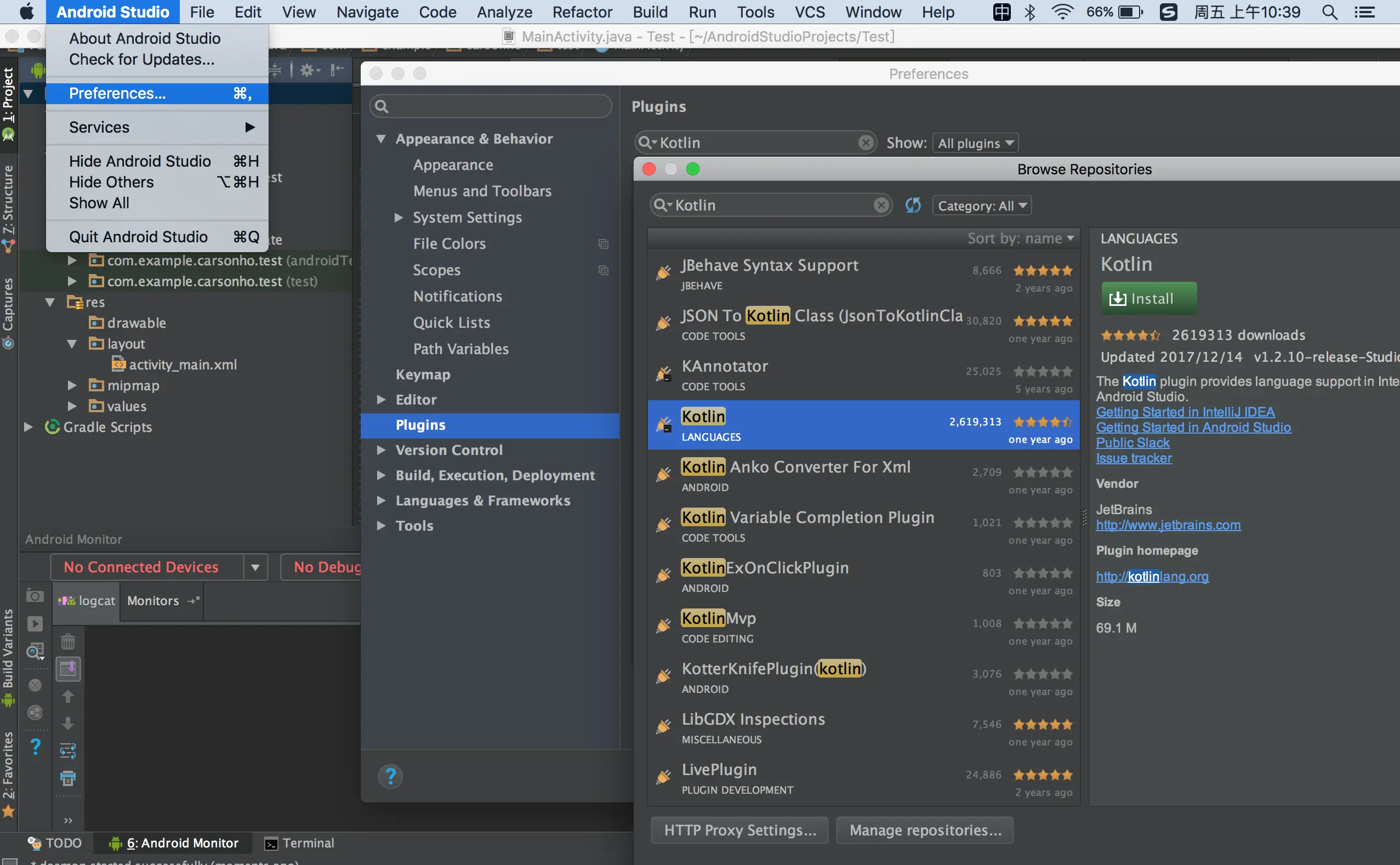 Android Studio3.0后的版本已经完美支持Kotlin,只需安装Kotlin插件即可,即:点击Android Studio Preference -> Plugins -> 搜索Kotlin Languages插件
