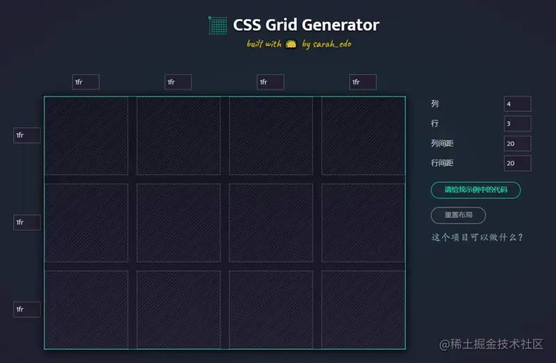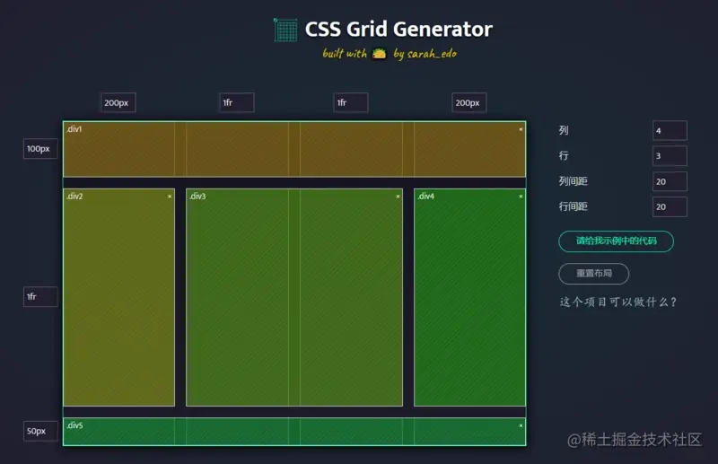 CSS Grid Generator是一个由Sarah Drasner创建的免费工具。它是一个可视化设计工具,允许咱们创建一个基本的 grid 布局,然后就可以使用生成对应的代码,帮助咱们快速布局。