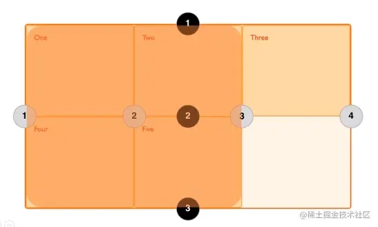 上面总共有 5 个网络轨道,水平方向灰色 1 和 2, 2 和 3, 3 和 4,竖直方向黑色的 1 和 2, 2 和 3,共 5 个。