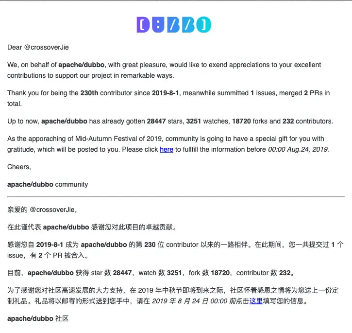 ps:第一次收到这样的中秋节礼物,加上 Dubbo 社区的活跃及阿里的重视度,还在做 PRC 或微服务技术选型的朋友可以考虑 Dubbo。
