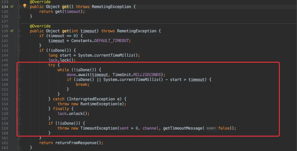 如图中的红框部分,Dubbo 自身调用了 get() 方法用于同步获取服务提供者的返回结果。