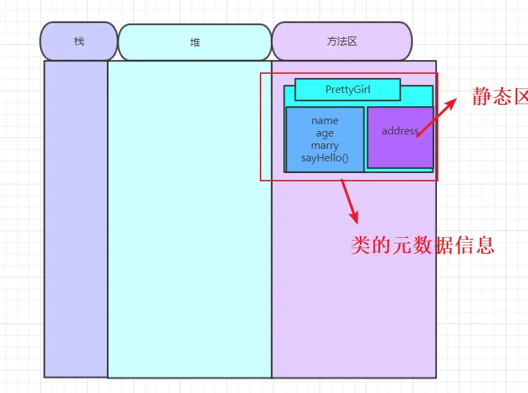 在栈内存为 pg1 变量申请一个空间,在堆内存为PrettyGirl对象申请空间,初始化完毕后将其地址值返回给pg1 ,通过pg1 .name和pg1 .age修改其值,静态的变量address是类公有的!