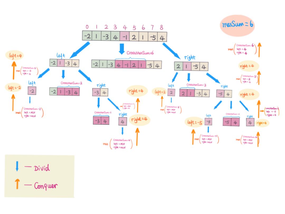所以一个思路就是我们每次都对数组分成左右两部分,然后分别计算上面三种情况的最大子序列和, 取出最大的即可。