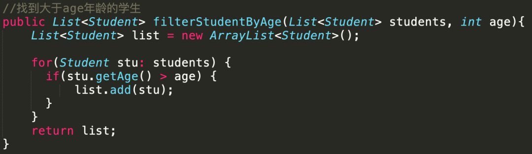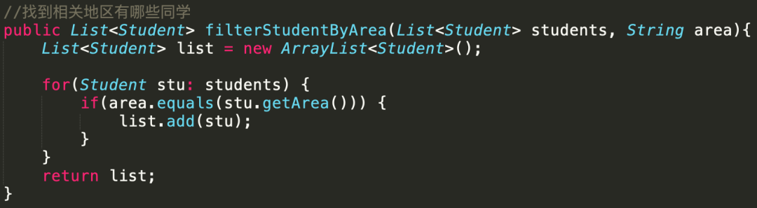 我们发现因为班导的两个需求,根据地区和年龄查找学生,我们程序员提供了两个方法,filterStudentByArea和filterStudentByAge。