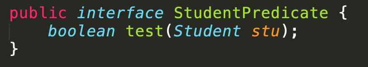 上面的核心代码就是p.test(stu);这个就是查询条件逻辑实现方法;要查询某个业务,只需要把相关业务的接口实现传给这个主方法就行了。
