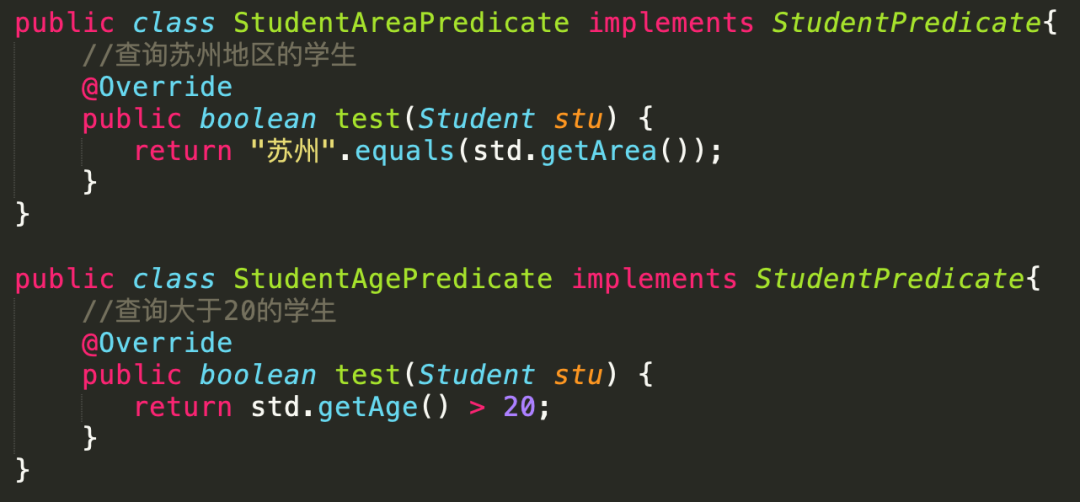 上面的方式代码相对比较优美,如有别的查询需求,只要实现StudentPredicate接口就行了。但这点也是个缺点,每个需求都要去写相关的接口实现。