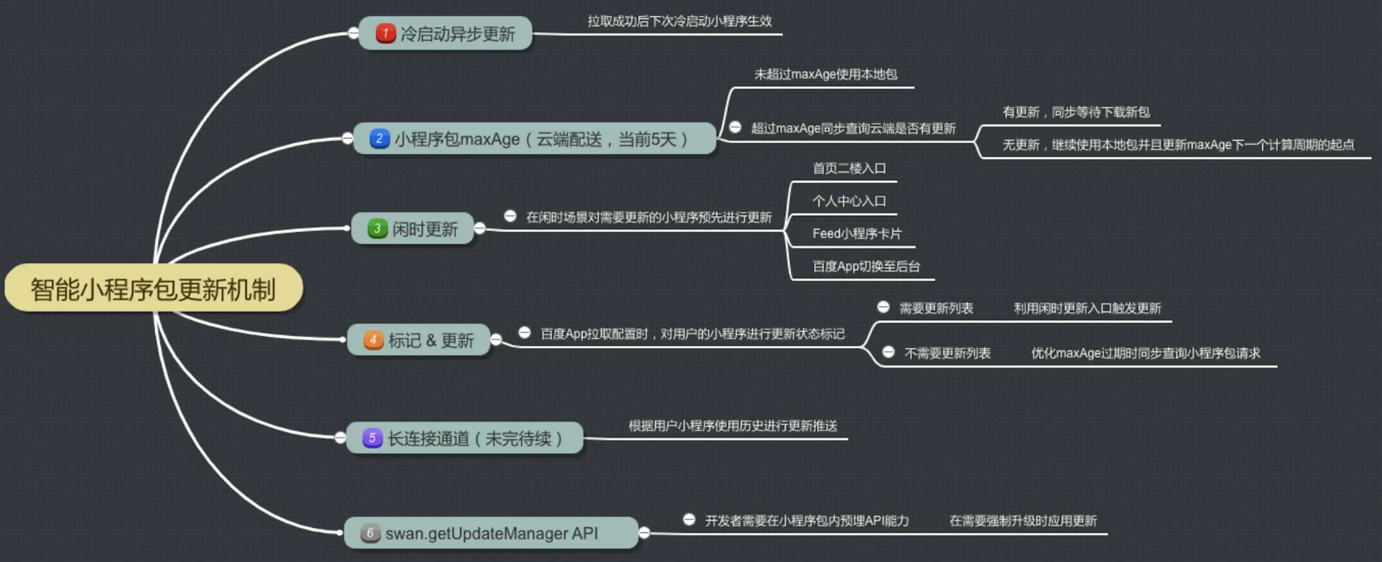 4. 标记更新:对用户当前使用过的小程序的更新状态进行统一标记,确定需要更新的小程序包列表。如:在百度App宿主每次冷启动拉取配置时,对当前用户使用过的小程序的更新状态进行标记。被标记为需要更新的列表则可以通过闲时更新方式触发小程序包的更新;对于不需要更新包的小程序则可优化掉当maxAge过期时同步等待查询小程序包更新状态的请求。