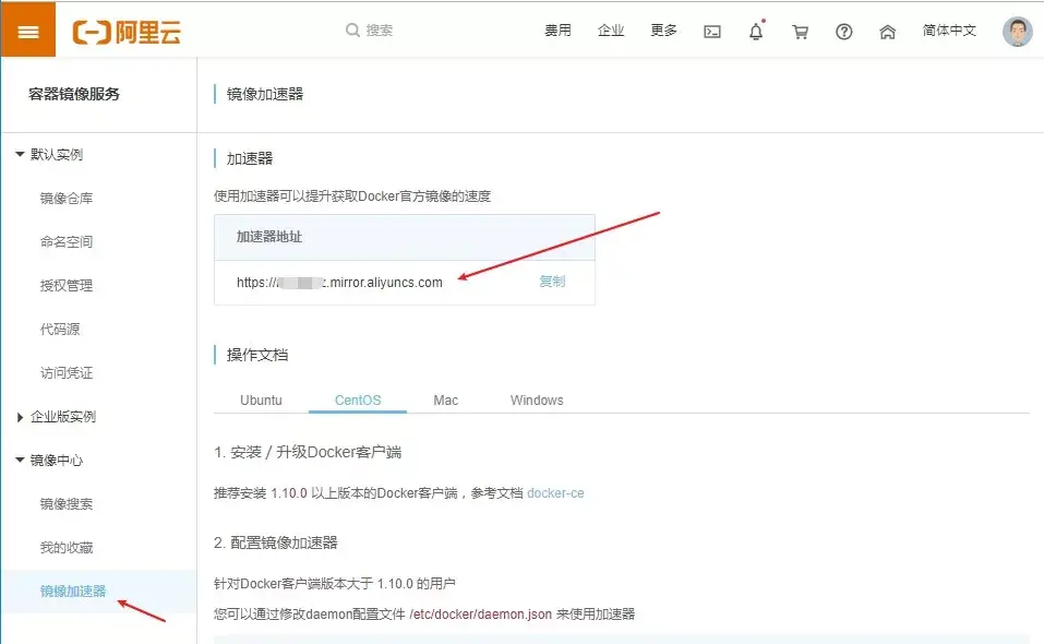 ExecStart=/usr/bin/dockerd-current --registry-mirror=https://rfcod7oz.mirror.aliyuncs.com \ #这个值可以登陆阿里云账号请参考下图