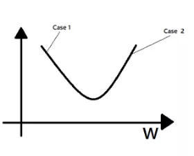 案例1. 假设W初始值小于其达到全局最小值时的值。这一点的斜率J对W的偏导数为负,因此,根据梯度下降方程,权值增加。