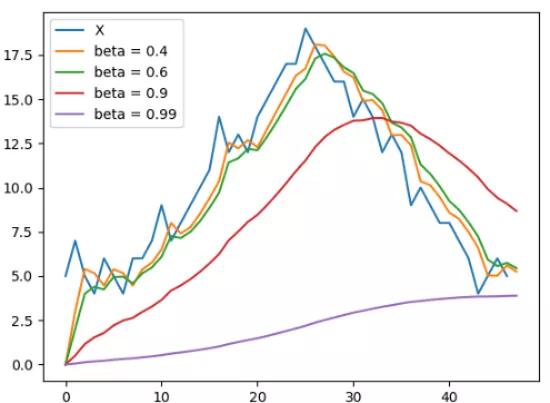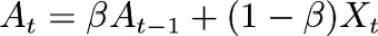 这里,A[i]表示X[i]值在i数据点处的移动平均值。参数β决定计算平均值的数值n。例如,如果β= 0.9,移动平均值用10个连续值来计算;如果β= 0.99, 移动平均值用100个连续值来计算。一般情况下,n的值可近似为: