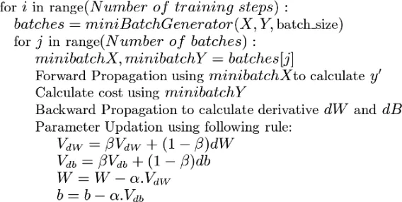 观察蓝色的路径,可以看到y轴上的运动是一系列的正负变化。将加权平均应用于几乎为零的运动,随后即出现y轴上的波动。对于x轴的运动也有类似的直觉。这减少了路径上的波动,最终,随着训练迭代次数的减少,神经网络在较短的时间内达到最小值。为此,引入两个新的变量VdW和Vdb来跟踪权值dW和偏置db的导数的加权平均值。