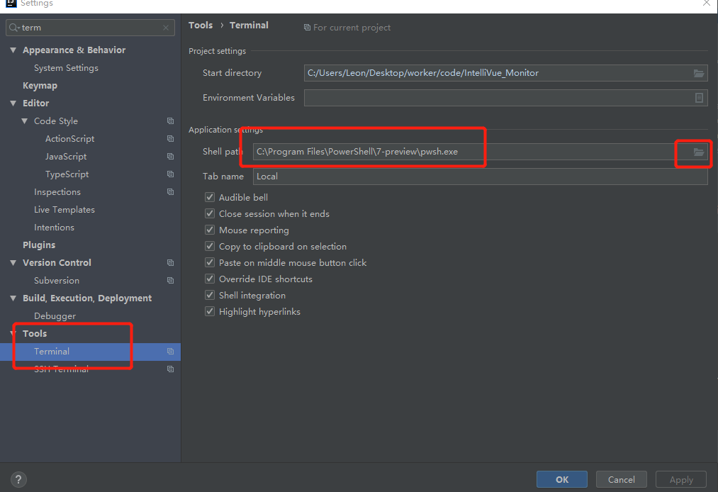 - 安装完成后,打开Idea设置,按下图选择你刚刚安装的powershell替换默认的cmd.exe