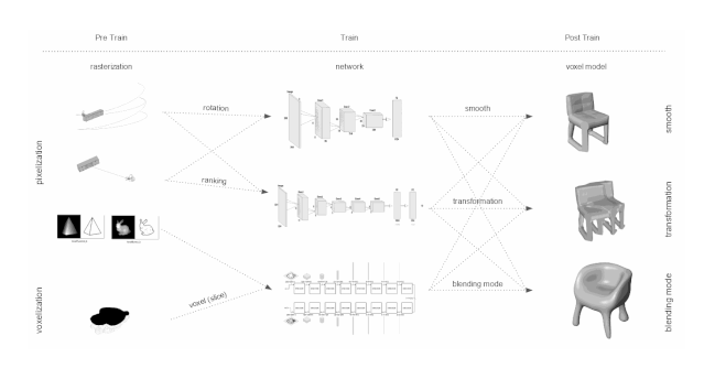 该论文首先介绍了体素建模的概念,并将其与传统建模进行比较。还阐述了像素映射和图形表示等概念,以最终检验基于机器学习的空间,以及几何光栅化过程的设计系统或工作流的原型实现。