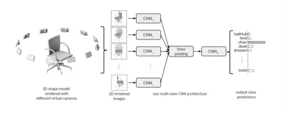 第一篇论文(链接后附)介绍了一个标准的CNN结构,经过处理,它能够独立识别形状的渲染视图。该结构表明即便是单一视图也可以识别出三维形状,并且其准确度远远高于使用最先进的三维形状描述符。而提供形状的多个视图能进一步提高识别率。