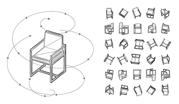 然后使用Rhinoceros 和Grasshopper编写一个工具脚本来创建物体处理器和验证器。在这个脚本中,一个围绕每个连续物体旋转的摄像头将以特定角度进行拍摄,并以JPG格式将图像保存在给定的目录。