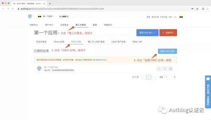 依次点击第三方登录 -> OIDC 应用选项卡,点击蓝色的「创建 OIDC 应用」按钮。使用 AuthingSSO SDK 集成单点登录