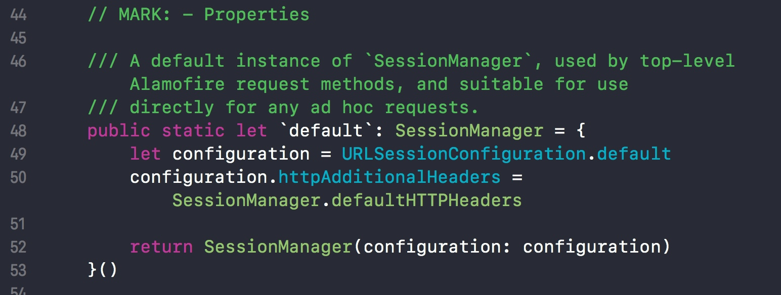 SessionManager 的 default方法中,使用默认的 URLSessionConfiguration,并添加了Alamofire自身的一些参数到配置中。然后初始化 SessionManager。