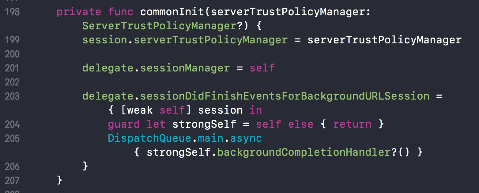 commonInit 函数中,delegate.sessionManager 被设置为自身 self,而 self 其实是持有 delegate 的。那么这里会不会造成循环引用呢?答案是不会。因为 delegate 的 sessionManager 是 weak 属性。