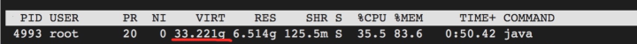 3.查到这里思路似乎断了,因为跟DirectBuffer似乎没啥关系。这时候我注意到进程虚拟内存非常高,已经超过ECS内存了。怀疑这里有些问题。