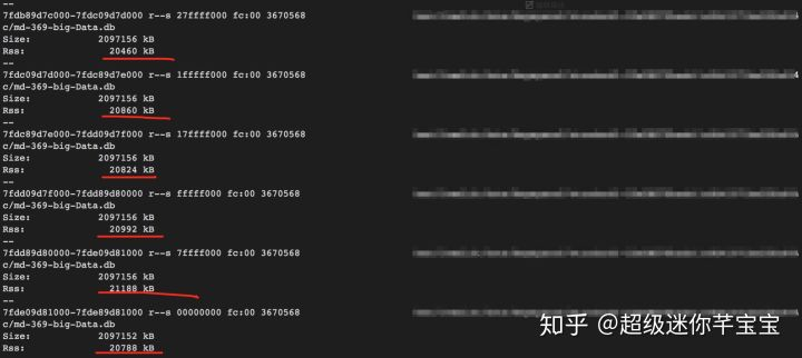 此时这些mmap file 虚拟内存是2G,但是物理内存是0(因为我之前重启过,调低过内存防止进程挂掉影响问题排查)。