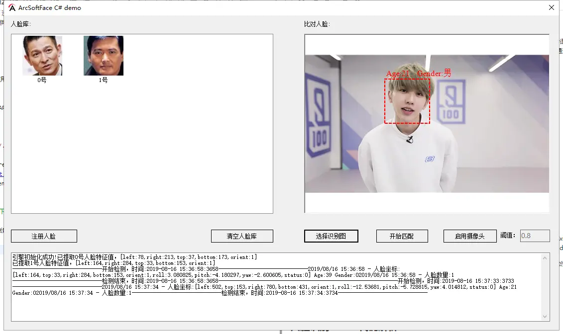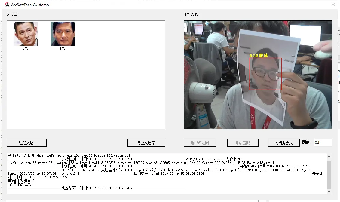 ASFFunctions.ASFFaceFeatureCompare 方法实际上调用的是SDK的对应方法,其返回值 simiarity为相似度。 Demo将获取到的人脸和人脸库中所有人脸都进行了对比,找出最为接近的一个特征。 在实际应用中,如果找到了一个符合我们置信度要求的特征,就可以直接退出循环了。