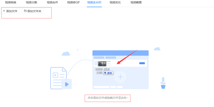 1、打开迅捷视频转换器把需要去水印的视频添加到软件中,添加时可以点击软件的“添加文件”/“添加文件夹”按钮添加也可以用拖拽的方式直接添加文件或文件夹。
