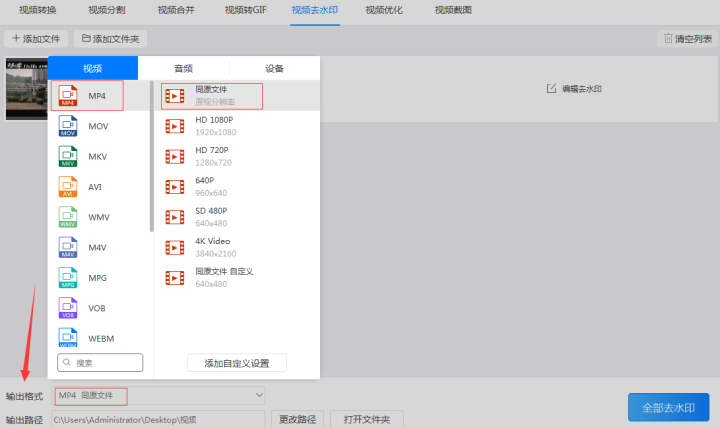 2、添加好视频后点击格式或输出格式按钮设置输出的视频格式和视频分辨率,设置时可以将视频格式设置为默认的‘mp4’格式,将视频分辨率设置为默认的‘同原文件’格式。