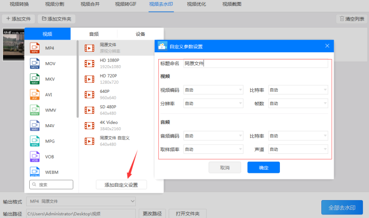 3、如果“mp4同原文件”格式或者软件预设的参数不能满足使用可以点击“添加自定义设置”按钮调整视频(视频编码、比特率、分辨率、帧数)和音频(音频编码、比特率、取样频率、声道)的各项参数,以满足使用。