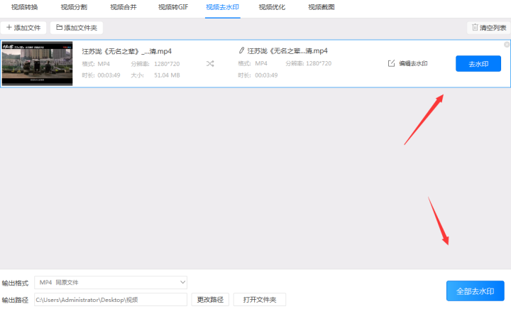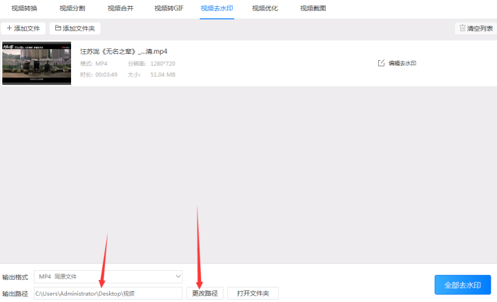 6、最后点击“去水印”/“全部去水印”按钮就可以去除视频水印了,而在去水印过程中会有一个进度条出现,当进度条到达100%就表示视频水印已经去除了。最后只要找到之前预设好的输出路径就可以打开去水印后的视频 。