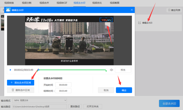 5、点击“编辑去水印”按钮设置去水印参数。“编辑去水印”的矩形框出现后调整时间区间(开始时间和结束时间)然后点击“添加去水印区域”,此时会出现一个蓝色矩形框,只需将蓝色矩形框覆盖至水印上然后点击“确定”按钮就调整好了。