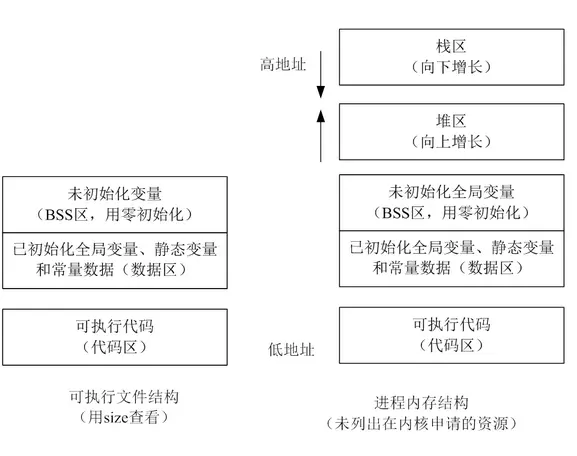 下图为可执行文件存储结构和Linux进程基本结构(部分)的对照图。