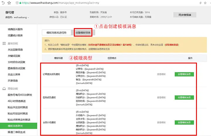 操作界面设置,模板消息发送任务和创建模板消息,只有服务号才能使用模板消息群发功能,首次使用先在公众号后台申请模版功能。