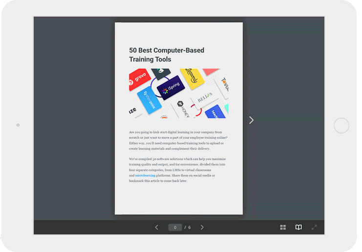在这篇文章中,我们将介绍如何制作一个.doc文件符合SCORM标准与iSpring Suite。它允许您将Word文档转换为具有翻页效果的交互式书籍。为了向您展示它的外观,我们将关于50种最佳基于计算机的培训工具的博客文章复制到Word,将文件转换为iSpring Suite中的SCORM,瞧...这就是我们得到的: