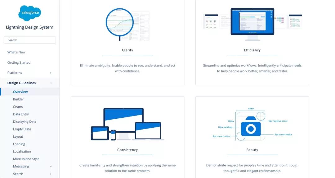 设计团队内部工程化的第一步,是需要所有设计师都有一个基本的设计共识,这一点是非常重要但很多设计团队容易忽略的。如果你平时注意的话,会在很多公司设计团队的设计系统中看到类似于设计原则或理念的东西。比如说 salesforce 的 Lightning Design System[2] 的是 Clarity、Efficiency、Consistency 和 Beauty,并且每个词下方都有详细的解释。这些设计理念当然不是随便写的,而是设计团队在一起讨论总结出来的,代表了他们共同的设计理念,是其设计产出所要达到的共同目标,也是根植于潜意识之中的设计准则。在很多时候,它甚至会成为你在设计时的决策因素,潜移默化地影响着你的设计。