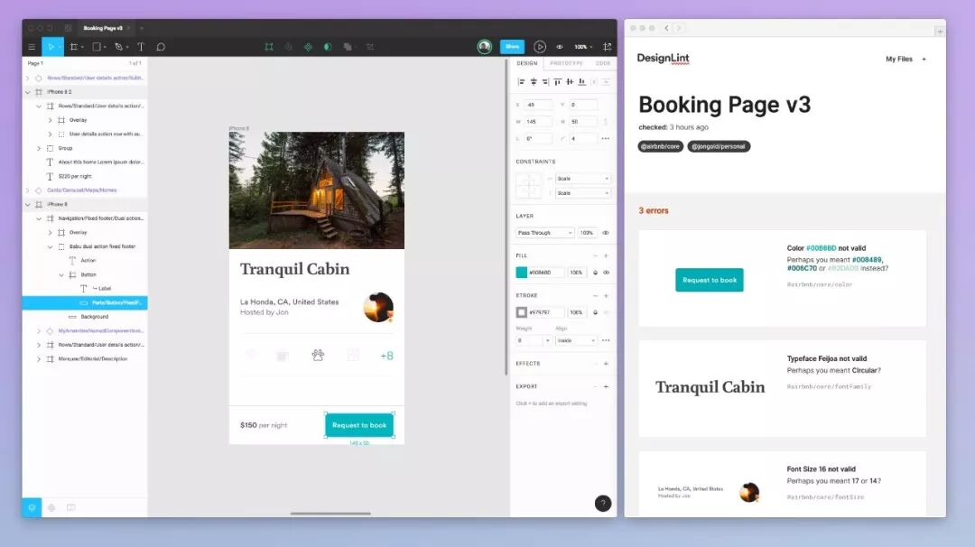 比如 Airbnb 通过 Figma 的 API 获取到设计图的色值、字号等内容,输入到既定规范中进行机器设计评审[5],当有不符合设计规范的色值或字号时便可以迅速发现。这样不仅仅缩短了评审时间,也能够发现一些人眼不能发现的错误细节。