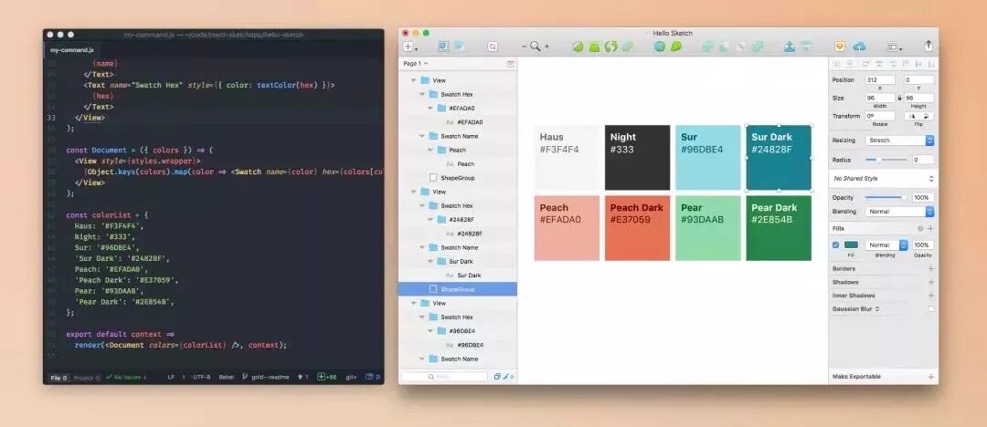 为此,Airbnb 设计团队自己研发了一个叫做 react-sketch.app[4] 的工具,它让设计师通过写代码来实现这个唯一的样式组件库,并把这份代码生成 Sketch 资源,让其他设计师可以直接在 Sketch 中使用这套资源进行设计。这套由代码组成的唯一设计数据源更好进行版本管理,也因为具备可编程性可以做更多事情。