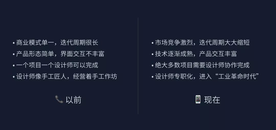但是随后,产品形态开始变得复杂,市场竞争变得激烈,产品迭代周期变得更短,我们需要适应一种快节奏的设计方式。这个时候,一个设计师很难应付一个项目,我们需要多人一起协作,每个设计师的工作也变得更加专职化了。此时,以前那种“作坊式”的设计方式便不再适用,我们需要更加系统化、规模化的设计方法来加速产品设计流程。