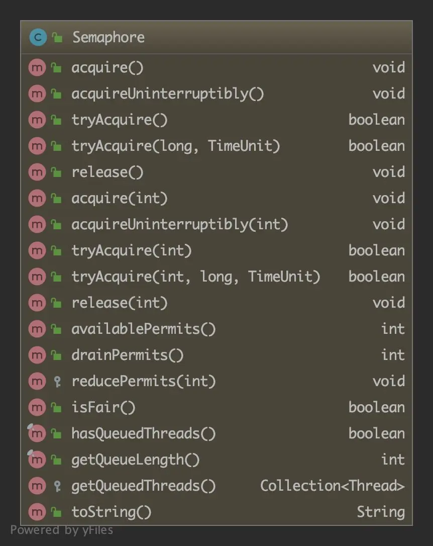 可以看到,Semaphore 的主要方法都是在嵌套类 FairSync 和 NonFairSync 及其父类 Sync 中实现的,内部嵌套类也是 AQS 的典型用法。