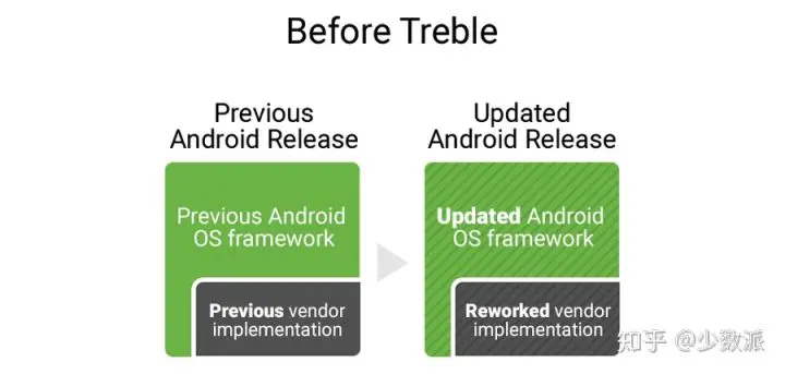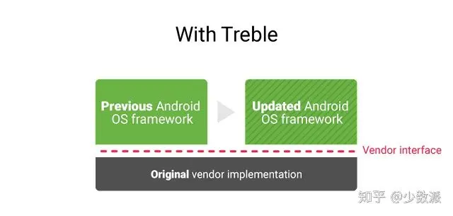 Project Treble 将 Android 软件操作系统(Android OS framework)和设备专属底层(vendor implementation)部分进行剥离,后者在以往升级过程中需要 OEM 厂商进行大量适配工作,因此 Google 将它接手过来,与芯片厂商合作将其重新设计为不再面向特定 Android 系统的通用底层代码。如此一来,OEM 厂商在适配新版本 Andorid 时的工作量和难度也大大降低。