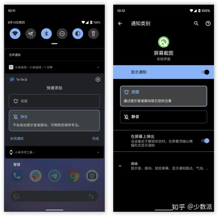 其中提醒通知拥有完整的提醒方式设置,包括提示音、振动和通知横幅;静音通知不能以任何形式发出提醒,但依然可以像提醒通知那样在锁屏显示通知内容、在主屏显示通知圆点、使用 Android Q 并没有上线的气泡提醒以及覆盖勿扰设置。
