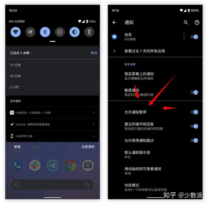 通知优先级并不是 Android 开发团队想做的唯一一处减法,此前在 Beta 3 测试版本中他们还直接取消过通知延后功能(各种缘由可参考下方 ArsTechnia 的访谈译文)。不过相比复杂的通知优先级,通知延后功能在部分用户看来其实非常实用,因此在最新的 Beta 6 测试版本中 Android 开发团队做了妥协,将通知延后功能从系统默认功能降级为用户可选功能,经常用到这个功能的用户前往「设置-应用和通知-通知」中开启「通知暂停(此处应是翻译错误)」即可继续使用。