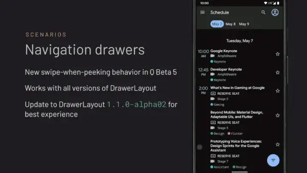 要想避免左侧划动返回手势与 Android 应用侧栏抽屉的冲突,目前相对靠谱的解决方案依然是 Google 在第五个测试版本中引入的 swipe-when-peeking 机制,即