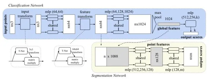 说到直接基于点云的方法就不得不提PointNet[8]和PointNet++[9], 点云数据具有一些显著的特点——数据点无序性、数据点数量可变性等,无序就表示网络必须能够在改变数据点顺序的情况下输出相同的结果,数量可变就表示网络必须能够处理不同数量的采样点。