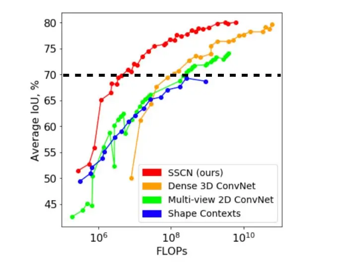 从下图可知在ShapeNet的3D分割的任务中SSCN(红色)相比经典的3D卷积网络(橙色)在mIOU=0.7的时候计算量相差一个数量级.