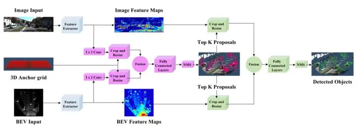 该作者提出了一个多视角(Multi-View)的3D物体检测框架,采用多模态的数据作为输入包括点云的BVE图, 点云FV图以及对应的RGB图。