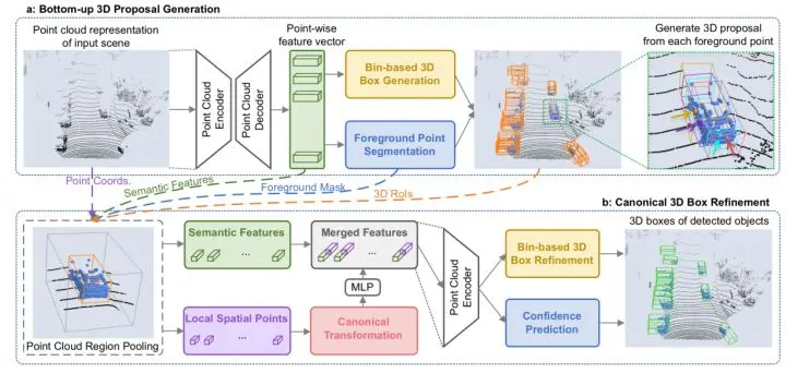 PointRCNN可以类比FastRCNN都属于两阶段的方法,PointRCNN第一阶段采用了pointnet++作为backbone提取proposal区域, 其中每个点都会产生一个anchor box保证了这一阶段高的召回率; 第二阶段将ROIPooling过的点云送入一个轻量级的pointnet++并将此阶段学习的局部特征和第一阶段学习到的特征进行融合用于对每一个proposal的box的回归和分类得到更准确的pose和size. 细节太多不做展开,请移步[11]了解详情.