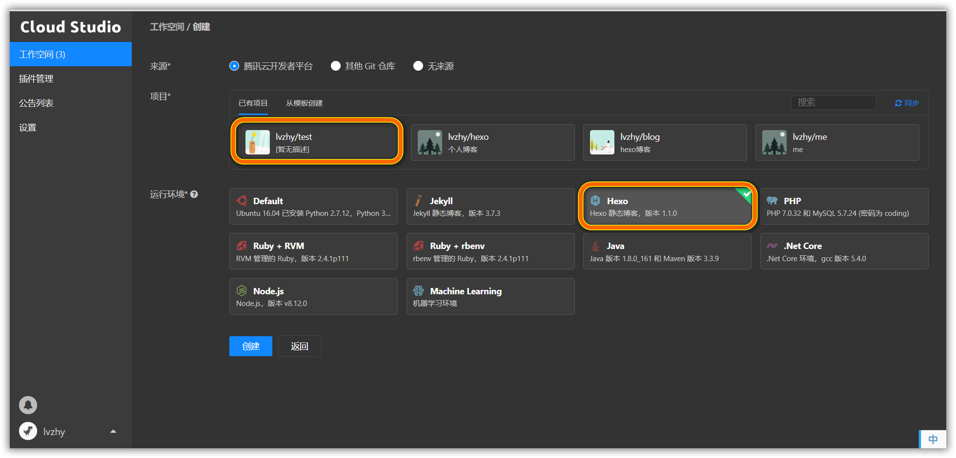 打开Cloud Studio官网,点击新建工作空间,来源选择“腾讯云开发者平台”,项目选择上一步创建的仓库,运行环境选择Hexo。